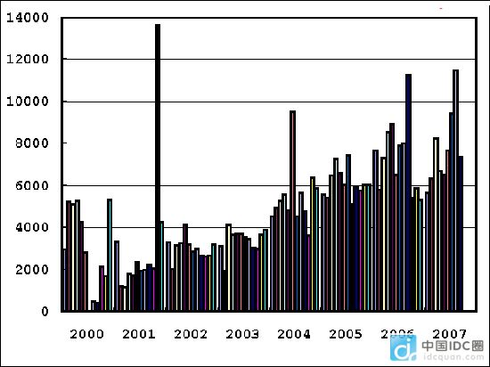 图中显示的数目四位域名注册不等。在2005年后的数据显示,只有剩余的域名注册,最近期的数字是相当一致,我认为这是一件好事,有没有大的投机商买盘。