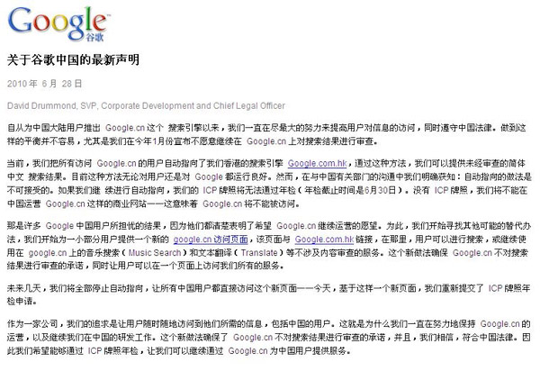 | 6月29日,谷歌公司高级副总裁、首席法律官大卫·德拉蒙德在官方博客上表示表示(http://www.google.com/press/new-approach-to-china/update_0610.html),谷歌未来几天将全部停止google.cn 页面的自动指向,并针对新页面提交了ICP牌照年检申请。
