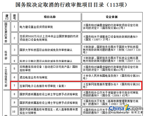 | 中国政府网(Gov.cn)近日发布了一份国务院文件,即《关于第五批取消和下放管理层级行政审批项目的决定》,在113项被取消的行政审批项目中,包含了取消互联网电子公告服务专项审批(备案)项目。