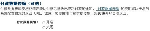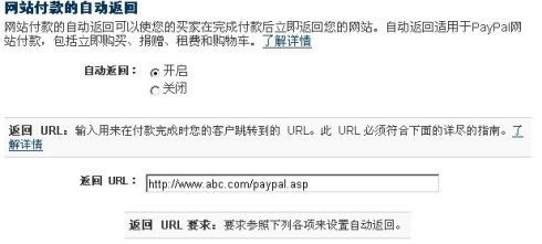 2、在“我的贝宝”-->“用户信息” -->“更多选项”-->“网站付款习惯设定” --> 自动返回设置为开启,返回url修改为自己网站的,付款数据传输设置为开启,其它不用改,点保存。如下图:
