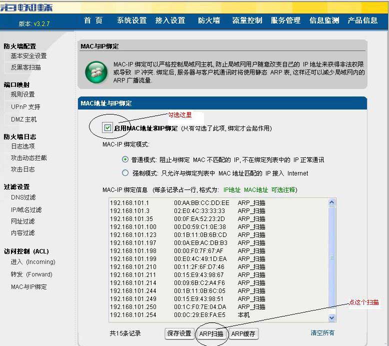 客户机绑定了之后就到路由绑定了,路由上的操作也都大同小异,我就以我们网吧的路由作为例子。 进入web控制页面,点击 防火墙 -》 MAC与IP绑定,勾选“启用MAC地址和IP绑定”,模式两种都可以,然后点击ARP扫描,就会出来一堆信息,这就是路由扫描的客户机MAC地址,然后点保存设置,OK。在路由上也绑定成功。